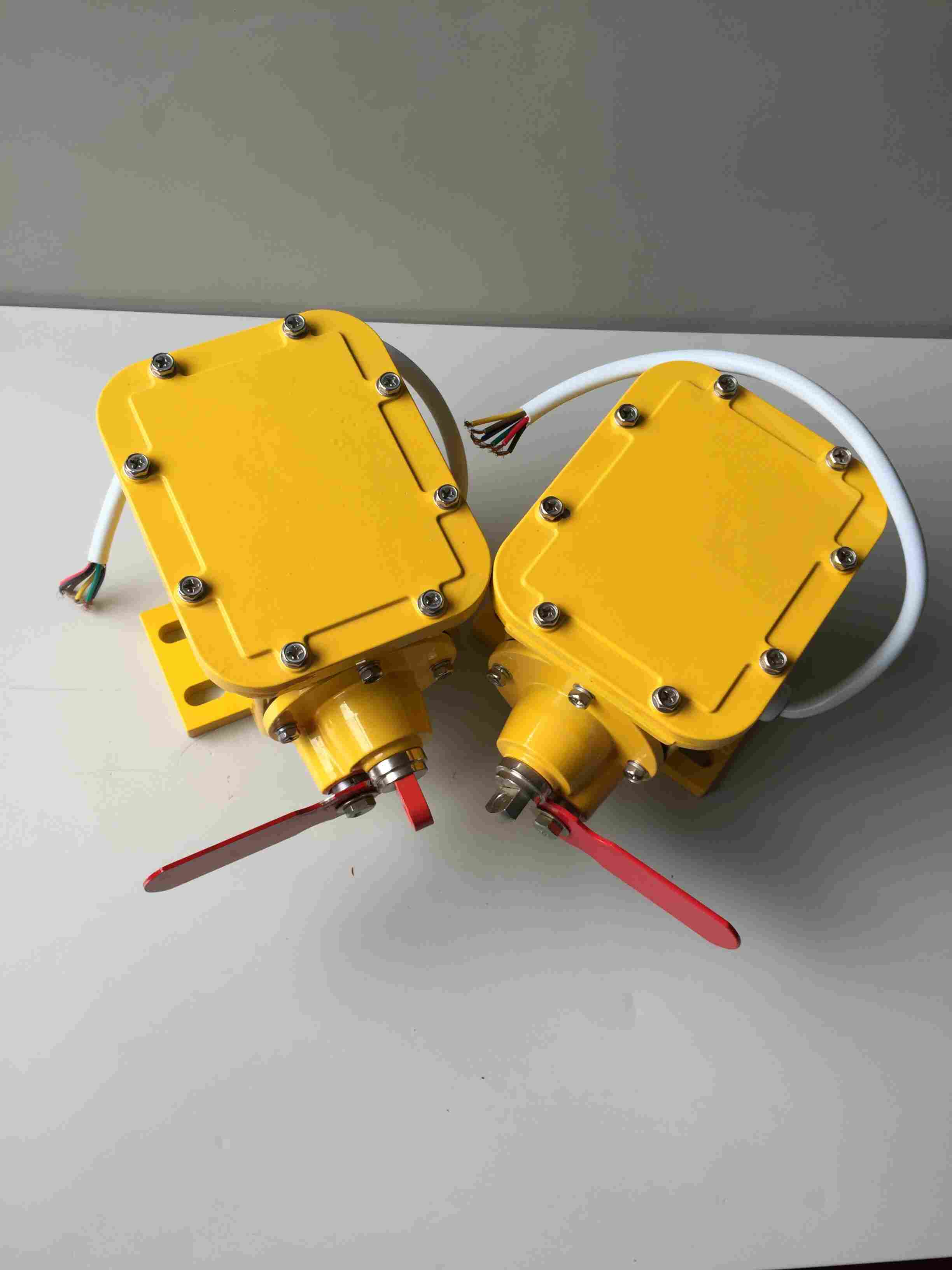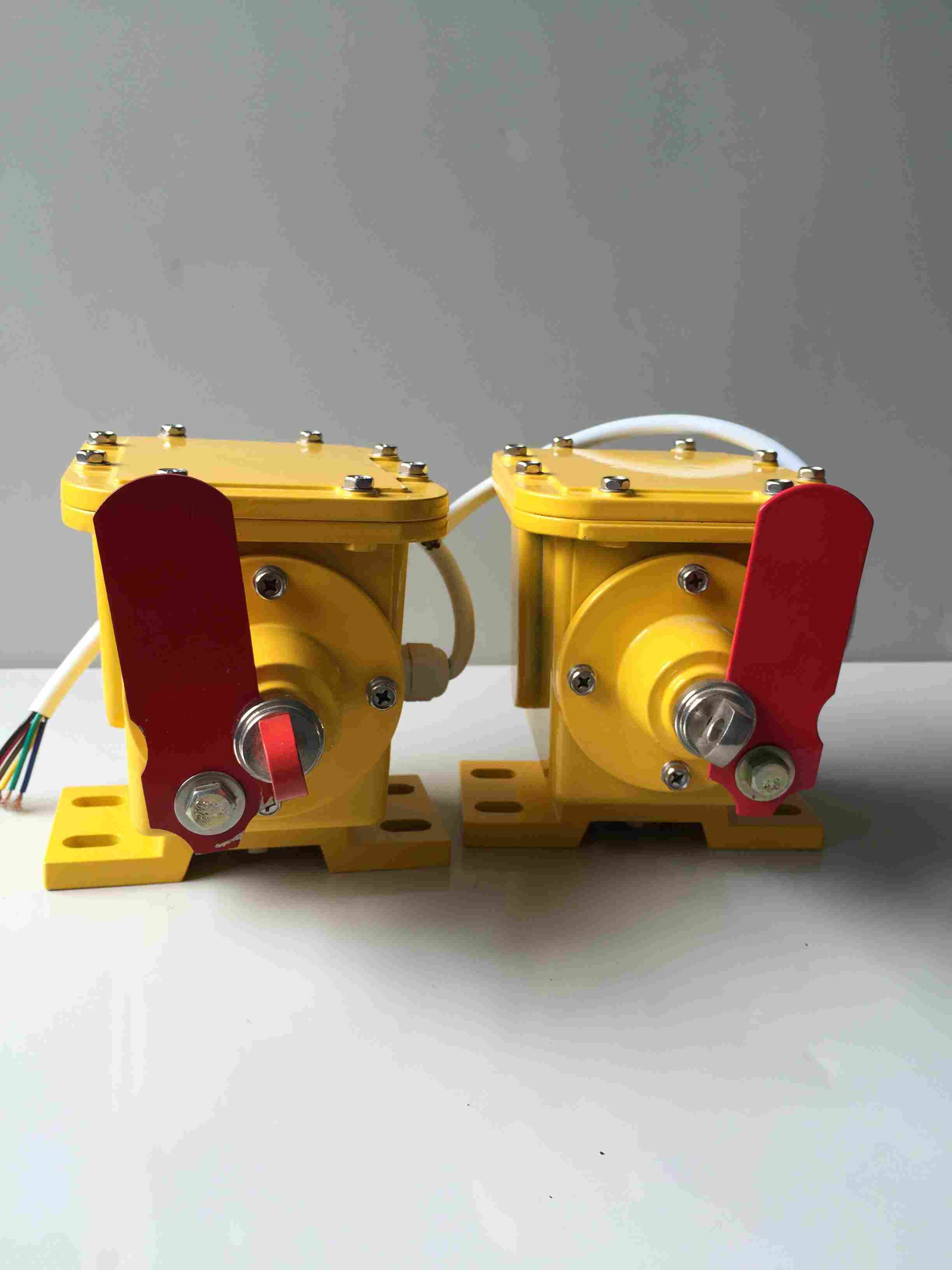 撕裂開(kāi)關(guān)應(yīng)成對(duì)安裝在皮帶兩側(cè),由兩段鋼絲繩連接起來(lái)(鋼絲繩有聚乙烯外套護(hù)層)。繩的一端固定在支撐托架上,另一端連接在撕裂開(kāi)關(guān)上的彈簧球上。兩段鋼繩在皮帶下面形成了一個(gè)和皮帶槽型一致的閉合回路。當(dāng)有物體戳穿或撕裂的皮帶懸吊下來(lái),掃落一條或兩條鋼繩時(shí),彈簧球被拉出底座,引起兩個(gè)微動(dòng)開(kāi)關(guān)發(fā)出報(bào)警信號(hào)或關(guān)掉輸送機(jī)。